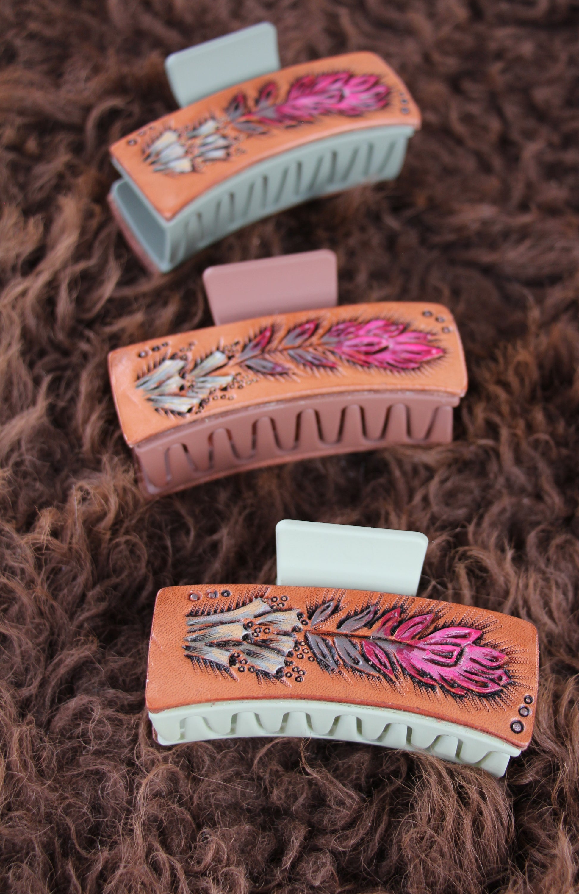 Romanticizing messy hair—the claw clip, but make it western. This medium claw clip features a hand-tooled and hand-painted leather paintbrush flower with sagebrush, crafted on Hermann Oak leather. Made in my Lemhi Valley shop.